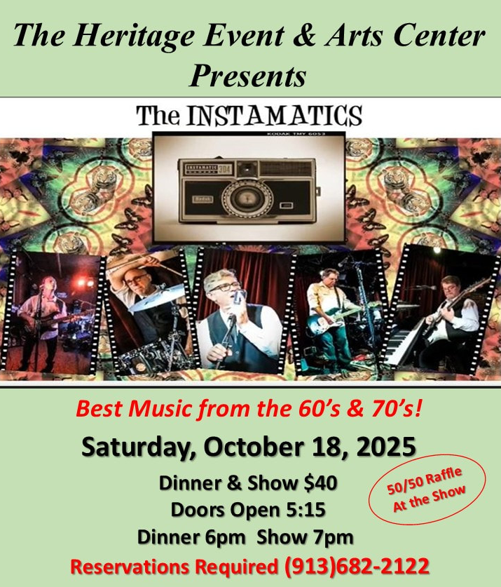 The Heritage Event & Arts Center presents: The Instamatics. Enjoy hits from the 1960s and early 1970s! Saturday, October 18, 2025. Dinner & show $40. Dinner 6 pm, show 7 pm. 50/50 raffle at the show.